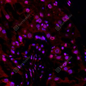 IF检测FOXO1蛋白(货号 GB114935)(红色). 样品: 人肾癌, 4%多聚甲醛 (货号G1101) 固定12-24小时. 抗原修复: Tris-EDTA抗原修复液(pH 9.0) (G1203), 98℃, 20分钟. 封闭: 3% BSA(货号GC305010)的PBS溶液, 室温孵育30分钟. —抗: 1: 500稀释, 4℃ 孵育过夜. 二抗: Cy3标记山羊抗兔IgG (H+L) (货号GB21303), 1: 300稀释, 室温孵育1小时. |