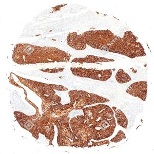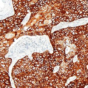 | IHC检测Cytokeratin 5/6蛋白(货号 GB151246). 样品: 人食管癌, 4%多聚甲醛 (货号G1101) 固定12-24小时. 抗原修复: 抗原修复仪(货号 ARI-4), Tris-EDTA抗原修复液(pH 9.0) (货号G1203), 水浴100℃, 25分钟. —抗: 1: 1000稀释, 4℃ 孵育过夜. 二抗: S-vision免疫组化多聚二抗(山羊抗小鼠), 即用型(货号G1301), 室温孵育20分钟. |