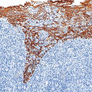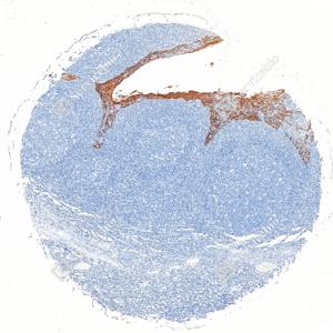 | IHC检测Cytokeratin 5/6蛋白(货号 GB151246). 样品: 人扁桃体, 4%多聚甲醛 (货号G1101) 固定12-24小时. 抗原修复: 抗原修复仪(货号 ARI-4), Tris-EDTA抗原修复液(pH 9.0) (货号G1203), 水浴100℃, 25分钟. —抗: 1: 1000稀释, 4℃ 孵育过夜. 二抗: S-vision免疫组化多聚二抗(山羊抗小鼠), 即用型(货号G1301), 室温孵育20分钟. |