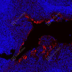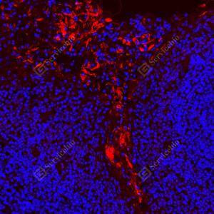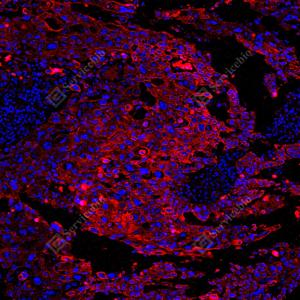 | IF检测Cytokeratin 5/6蛋白(货号 GB151246)(红色). 样品: 人扁桃体, 4%多聚甲醛 (货号G1101) 固定12-24小时. 抗原修复: 抗原修复仪(货号 ARI-4), Tris-EDTA抗原修复液(pH 9.0) (货号G1203), 水浴100℃, 25分钟. 封闭: 3% BSA(货号GC305010)的PBS溶液, 室温孵育30分钟. —抗: 1: 1000稀释, 4℃ 孵育过夜. 二抗: Cy3标记山羊抗小鼠IgG (H+L) (货号GB21301), 1: 300稀释, 室温孵育1小时. |