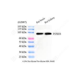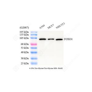 | WB检测FOXO1蛋白(货号 GB154935). 样品: 经RIPA裂解液(货号G2002)处理的蛋白质. 封闭: 3%脱脂牛奶(货号GC310001)溶于TBST溶液, 室温孵育1小时. —抗: 1: 1000稀释, 4℃ 孵育过夜. 二抗: HRP标记山羊抗兔IgG (H+L) (货号GB23303), 1: 5000稀释, 室温孵育1小时. |