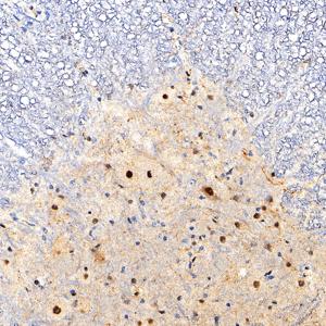 | IHC检测FOXO1蛋白(货号 GB154935). 样品: 人胃癌, 4%多聚甲醛 (货号G1101) 固定12-24小时. 抗原修复: Tris-EDTA抗原修复液(pH 9.0) (G1203), 100℃, 25分钟. —抗: 1: 10000稀释, 4℃ 孵育过夜. 二抗: S-vision免疫组化多聚二抗(山羊抗兔),即用型 (货号G1302), 室温孵育20分钟. |