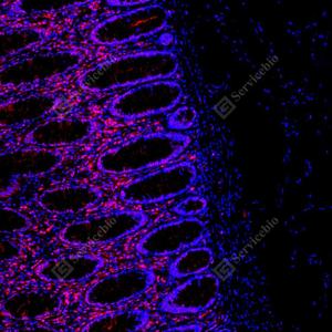 | IF检测FOXO1蛋白(货号 GB154935)(红色). 样品: 人结肠, 4%多聚甲醛 (货号G1101) 固定12-24小时. 抗原修复: Tris-EDTA抗原修复液(pH 9.0) (G1203), 100℃, 25分钟. 封闭: 3% BSA(货号GC305010)的PBS溶液, 室温孵育30分钟. —抗: 1: 10000稀释, 4℃ 孵育过夜. 二抗: Cy3标记山羊抗兔IgG (H+L) (货号GB21303), 1: 300稀释, 室温孵育1小时. |