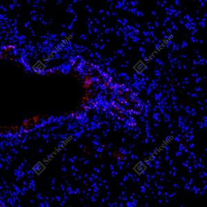 | IF检测FOXO1蛋白(货号 GB154935)(红色). 样品: 小鼠肺, 4%多聚甲醛 (货号G1101) 固定12-24小时. 抗原修复: Tris-EDTA抗原修复液(pH 9.0) (G1203), 100℃, 25分钟. 封闭: 3% BSA(货号GC305010)的PBS溶液, 室温孵育30分钟. —抗: 1: 10000稀释, 4℃ 孵育过夜. 二抗: Cy3标记山羊抗兔IgG (H+L) (货号GB21303), 1: 300稀释, 室温孵育1小时. |