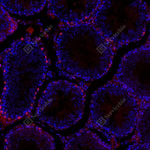 | IF检测FOXO1蛋白(货号 GB154935)(红色). 样品: 大鼠睾丸, 4%多聚甲醛 (货号G1101) 固定12-24小时. 抗原修复: Tris-EDTA抗原修复液(pH 9.0) (G1203), 100℃, 25分钟. 封闭: 3% BSA(货号GC305010)的PBS溶液, 室温孵育30分钟. —抗: 1: 10000稀释, 4℃ 孵育过夜. 二抗: Cy3标记山羊抗兔IgG (H+L) (货号GB21303), 1: 300稀释, 室温孵育1小时. |