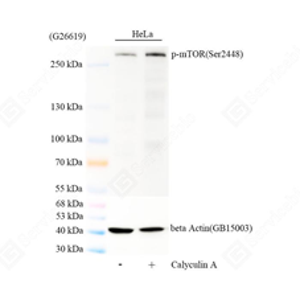 MTOR, also named as FRAP1, FRAP, FRAP2 and RAPT1, belongs to the PI3/PI4-kinase family. MTOR is a Ser/Thr protein kinase that functions as an ATP and amino acid sensor to balance nutrient availability and cell growth. MTOR is kinase subunit of both mTORC1 and mTORC2, which regulate cell growth and survival in response to nutrient and hormonal signals. MTOR has a calculated molecular mass of 289 kDa, and always can be detected at about 250 kDa due to some modifications.