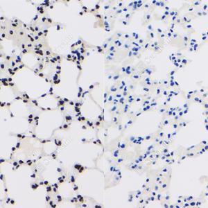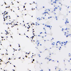| IHC检测Phospho-CREB (S133)蛋白(货号 GB114322). 样品: 小鼠肺组织(非磷酸化封闭), 4%多聚甲醛 (货号G1101) 固定12-24小时. 抗原修复: 柠檬酸抗原修复液(干粉, pH 6.0) (G1201), 98℃, 20分钟. —抗: 1: 700稀释, 4℃ 孵育过夜. 二抗: HRP标记山羊抗兔IgG (H+L) (货号GB23303), 1: 200稀释, 室温孵育1小时. |