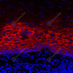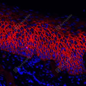 | IF检测Syndecan-1/CD138蛋白(货号 GB115052)(红色). 样品: 人食管, 4%多聚甲醛 (货号G1101) 固定12-24小时. 抗原修复: Tris-EDTA抗原修复液(pH 9.0) (G1203), 98℃, 20分钟. 封闭: 3% BSA(货号GC305010)的PBS溶液, 室温孵育30分钟. —抗: 1: 100稀释, 4℃ 孵育过夜. 二抗: Cy3标记山羊抗兔IgG (H+L) (货号GB21303), 1: 300稀释, 室温孵育1小时. |