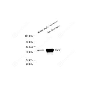 WB检测Doublecortin蛋白(货号 GB15317). 样品: 经RIPA裂解液(货号G2002)处理的蛋白质. 封闭: 3%脱脂牛奶(货号GC310001)溶于TBST溶液, 室温孵育1小时. —抗: 1: 2000稀释, 4℃ 孵育过夜. 二抗: HRP标记山羊抗小鼠IgG (H+L) (货号GB23301), 1: 5000稀释, 室温孵育1小时. |