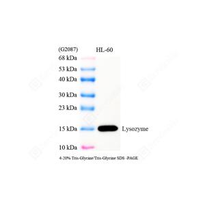 | WB检测Lysozyme蛋白(货号 GB15345). 样品: 经RIPA裂解液(货号G2002)处理的蛋白质. 封闭: 3%脱脂牛奶(货号GC310001)溶于TBST溶液, 室温孵育1小时. —抗: 1: 3000稀释, 4℃ 孵育过夜. 二抗: HRP标记山羊抗兔IgG (H+L) (货号GB23303), 1: 5000稀释, 室温孵育1小时. |