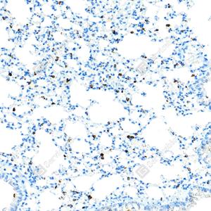 | IHC检测Lysozyme蛋白(货号 GB15345). 样品: 小鼠肺, 4%多聚甲醛 (货号G1101) 固定12-24小时. 抗原修复: 柠檬酸抗原修复液 (干粉, pH 6.0) (G1201), 高压锅均匀喷气计时2分钟. —抗: 1: 200稀释, 4℃ 孵育过夜. 二抗: S-vision免疫组化多聚二抗(山羊抗兔),即用型 (货号G1302), 室温孵育20分钟. |
