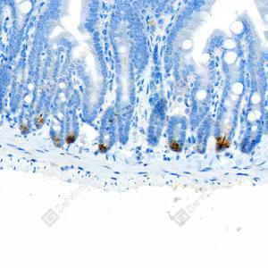 | IHC检测Lysozyme蛋白(货号 GB15345). 样品: 小鼠小肠, 4%多聚甲醛 (货号G1101) 固定12-24小时. 抗原修复: 柠檬酸抗原修复液 (干粉, pH 6.0) (G1201), 高压锅均匀喷气计时2分钟. —抗: 1: 100稀释, 4℃ 孵育过夜. 二抗: S-vision免疫组化多聚二抗(山羊抗兔),即用型 (货号G1302), 室温孵育20分钟. |