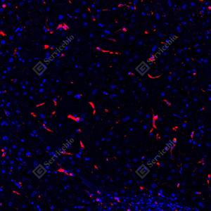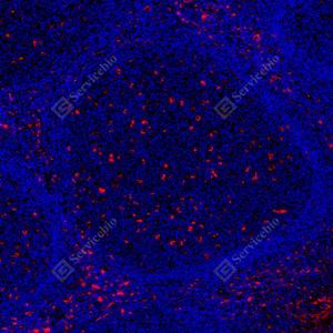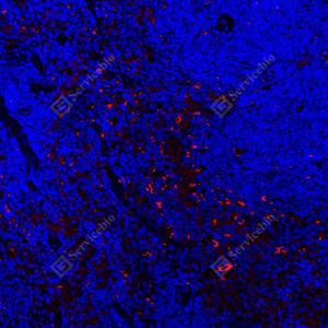 | IF检测 Lysozyme蛋白(货号 GB15345)(红色). 样品: 小鼠脾, 4%多聚甲醛 (货号G1101) 固定12-24小时. 抗原修复: 柠檬酸抗原修复液 (干粉, pH 6.0) (G1201), 高压锅均匀喷气计时2分钟. —抗: 1: 200稀释, 4℃ 孵育过夜. 二抗: Cy3标记山羊抗兔IgG (H+L) (货号GB21303), 1: 300稀释, 室温孵育1小时. |