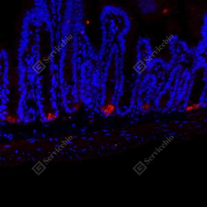 | IF检测 Lysozyme蛋白(货号 GB15345)(红色). 样品: 小鼠小肠, 4%多聚甲醛 (货号G1101) 固定12-24小时. 抗原修复: 柠檬酸抗原修复液 (干粉, pH 6.0) (G1201), 高压锅均匀喷气计时2分钟. —抗: 1: 200稀释, 4℃ 孵育过夜. 二抗: Cy3标记山羊抗兔IgG (H+L) (货号GB21303), 1: 300稀释, 室温孵育1小时. |
