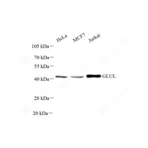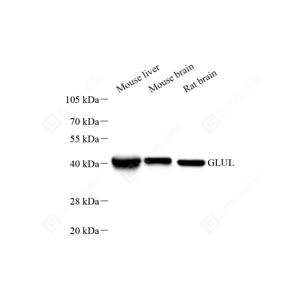 WB检测Glutamine Synthetase蛋白(货号 GB151177). 样品: 经RIPA裂解液(货号G2002)处理的蛋白质. 封闭: 3%脱脂牛奶(货号GC310001)溶于TBST溶液, 室温孵育1小时. —抗: 1: 1000稀释, 4℃ 孵育过夜. 二抗: HRP标记山羊抗小鼠IgG (H+L) (货号GB23301), 1: 5000稀释, 室温孵育1小时. |