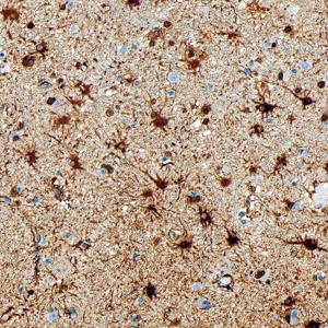 IHC检测Glutamine Synthetase蛋白(货号 GB151177). 样品: 人脑, 4%多聚甲醛 (货号G1101) 固定12-24小时. 抗原修复: Tris-EDTA抗原修复液(pH 9.0) (G1203), 98℃, 20分钟. —抗: 1: 5000稀释, 4℃ 孵育过夜. 二抗: S-vision免疫组化多聚二抗(山羊抗小鼠), 即用型(货号G1301), 室温孵育20分钟. |