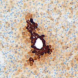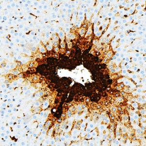 IHC检测Glutamine Synthetase蛋白(货号 GB151177). 样品: 小鼠肝脏炎症, 4%多聚甲醛 (货号G1101) 固定12-24小时. 抗原修复: Tris-EDTA抗原修复液(pH 9.0) (G1203), 98℃, 20分钟. —抗: 1: 5000稀释, 4℃ 孵育过夜. 二抗: S-vision免疫组化多聚二抗(山羊抗小鼠), 即用型(货号G1301), 室温孵育20分钟. |