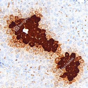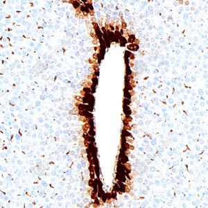 IHC检测Glutamine Synthetase蛋白(货号 GB151217). 样品: 大鼠肝, 4%多聚甲醛 (货号G1101) 固定12-24小时. 抗原修复: 柠檬酸抗原修复液(干粉, pH 6.0) (G1201), 高压锅均匀喷气计时2分钟. —抗: 1: 1500稀释, 4℃ 孵育过夜. 二抗: S-vision免疫组化多聚二抗(山羊抗兔),即用型 (货号G1302), 室温孵育20分钟. |