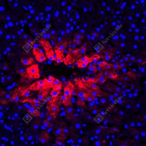 IF检测Glutamine Synthetase蛋白(货号 GB151217)(红色). 样品: 大鼠肝, 4%多聚甲醛 (货号G1101) 固定12-24小时. 抗原修复: 柠檬酸抗原修复液(干粉, pH 6.0) (G1201), 高压锅均匀喷气计时2分钟. 封闭: 3% BSA(货号GC305010)的PBS溶液, 室温孵育30分钟. —抗: 1: 1500稀释, 4℃ 孵育过夜. 二抗: Cy3标记山羊抗兔IgG (H+L) (货号GB21303), 1: 300稀释, 室温孵育1小时. |