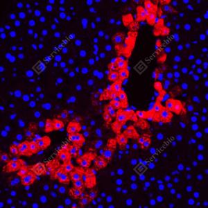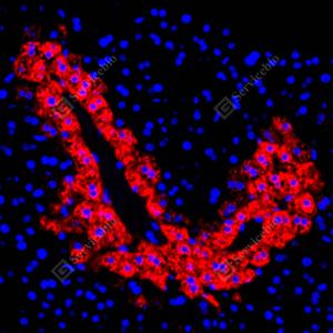 IF检测Glutamine Synthetase蛋白(货号 GB151217)(红色). 样品: 人肝, 4%多聚甲醛 (货号G1101) 固定12-24小时. 抗原修复: 柠檬酸抗原修复液(干粉, pH 6.0) (G1201), 高压锅均匀喷气计时2分钟. 封闭: 3% BSA(货号GC305010)的PBS溶液, 室温孵育30分钟. —抗: 1: 1500稀释, 4℃ 孵育过夜. 二抗: Cy3标记山羊抗兔IgG (H+L) (货号GB21303), 1: 300稀释, 室温孵育1小时. |