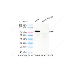 WB检测p63蛋白(货号 GB150065). 样品: 经RIPA裂解液(货号G2002)处理的蛋白质. 封闭: 3%脱脂牛奶(货号GC310001)溶于TBST溶液, 室温孵育1小时. —抗: 1: 500稀释, 4℃ 孵育过夜. 二抗: HRP标记山羊抗兔IgG (H+L) (货号GB23303), 1: 5000稀释, 室温孵育1小时. |