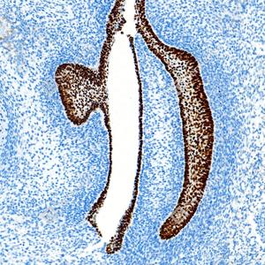 IHC检测p63蛋白(货号 GB150065). 样品: 小鼠胚胎, 4%多聚甲醛 (货号G1101) 固定12-24小时. 抗原修复: 柠檬酸抗原修复液 (干粉, pH 6.0) (G1201), 高压锅均匀喷气计时2分钟. —抗: 1: 3000稀释, 4℃ 孵育过夜. 二抗: S-vision免疫组化多聚二抗(山羊抗兔),即用型 (货号G1302), 室温孵育20分钟. |