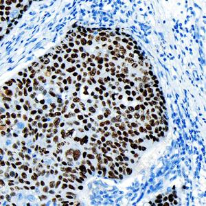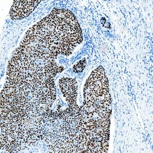 IHC检测p63蛋白(货号 GB150065). 样品: 人食道癌, 4%多聚甲醛 (货号G1101) 固定12-24小时. 抗原修复: 柠檬酸抗原修复液 (干粉, pH 6.0) (G1201), 高压锅均匀喷气计时2分钟. —抗: 1: 3000稀释, 4℃ 孵育过夜. 二抗: S-vision免疫组化多聚二抗(山羊抗兔),即用型 (货号G1302), 室温孵育20分钟. |