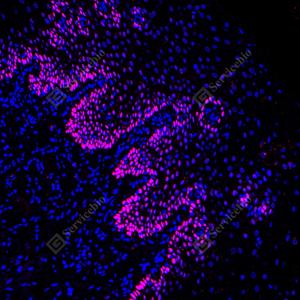 IF检测p63蛋白(货号 GB150065)(红色). 样品: 小鼠食管, 4%多聚甲醛 (货号G1101) 固定12-24小时. 抗原修复: 柠檬酸抗原修复液 (干粉, pH 6.0) (G1201), 高压锅均匀喷气计时2分钟. —抗: 1: 5000稀释, 4℃ 孵育过夜. 二抗: Cy3标记山羊抗兔IgG (H+L) (货号GB21303), 1: 300稀释, 室温孵育1小时. |