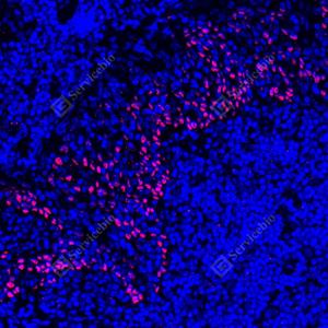 IF检测p63蛋白(货号 GB150065)(红色). 样品: 人扁桃体, 4%多聚甲醛 (货号G1101) 固定12-24小时. 抗原修复: 柠檬酸抗原修复液 (干粉, pH 6.0) (G1201), 高压锅均匀喷气计时2分钟. —抗: 1: 5000稀释, 4℃ 孵育过夜. 二抗: Cy3标记山羊抗兔IgG (H+L) (货号GB21303), 1: 300稀释, 室温孵育1小时. |