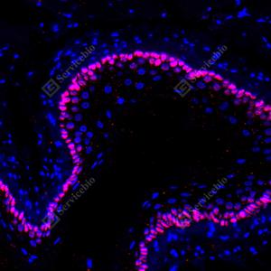IF检测p63蛋白(货号 GB150065)(红色). 样品: 人食管, 4%多聚甲醛 (货号G1101) 固定12-24小时. 抗原修复: 柠檬酸抗原修复液 (干粉, pH 6.0) (G1201), 高压锅均匀喷气计时2分钟. —抗: 1: 5000稀释, 4℃ 孵育过夜. 二抗: Cy3标记山羊抗兔IgG (H+L) (货号GB21303), 1: 300稀释, 室温孵育1小时. |