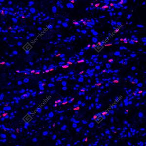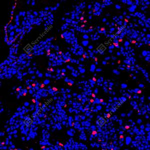 IF检测p63蛋白(货号 GB150065)(红色). 样品: 小鼠胎盘, 4%多聚甲醛 (货号G1101) 固定12-24小时. 抗原修复: 柠檬酸抗原修复液 (干粉, pH 6.0) (G1201), 高压锅均匀喷气计时2分钟. —抗: 1: 5000稀释, 4℃ 孵育过夜. 二抗: Cy3标记山羊抗兔IgG (H+L) (货号GB21303), 1: 300稀释, 室温孵育1小时. |