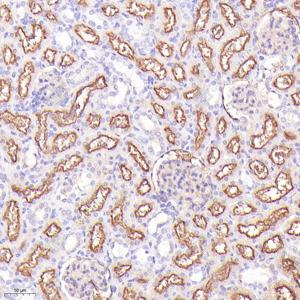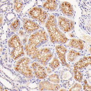IHC检测DPP4/CD26蛋白(货号 GB114937). 样品: 人肾, 4%多聚甲醛 (货号G1101) 固定12-24小时. 抗原修复: 柠檬酸抗原修复液(干粉, pH 6.0) (G1201), 98℃, 20分钟. —抗: 1: 1000稀释, 4℃ 孵育过夜. 二抗: HRP标记山羊抗兔IgG (H+L) (货号GB23303), 1: 200稀释, 室温孵育1小时. |