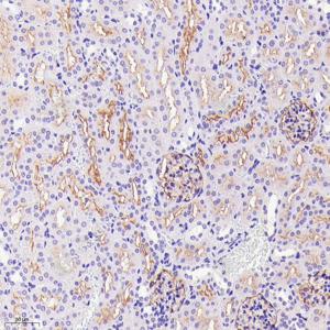 IHC检测DPP4/CD26蛋白(货号 GB114937). 样品: 小鼠肾, 4%多聚甲醛 (货号G1101) 固定12-24小时. 抗原修复: 柠檬酸抗原修复液(干粉, pH 6.0) (G1201), 98℃, 20分钟. —抗: 1: 1000稀释, 4℃ 孵育过夜. 二抗: HRP标记山羊抗兔IgG (H+L) (货号GB23303), 1: 200稀释, 室温孵育1小时. |