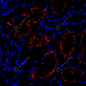 IF检测DPP4/CD26蛋白(货号 GB114937)(红色). 样品: 人肾, 4%多聚甲醛 (货号G1101) 固定12-24小时. 抗原修复: Tris-EDTA抗原修复液(pH 9.0) (G1203), 98℃, 20分钟. 封闭: 3% BSA(货号GC305010)的PBS溶液, 室温孵育30分钟. —抗: 1: 500稀释, 4℃ 孵育过夜. 二抗: Cy3标记山羊抗兔IgG (H+L) (货号GB21303), 1: 300稀释, 室温孵育1小时. |