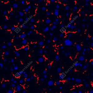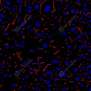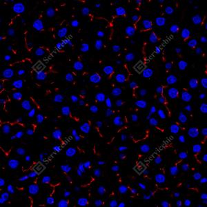 IF检测DPP4/CD26蛋白(货号 GB114937)(红色). 样品: 小鼠肝, 4%多聚甲醛 (货号G1101) 固定12-24小时. 抗原修复: Tris-EDTA抗原修复液(pH 9.0) (G1203), 98℃, 20分钟. 封闭: 3% BSA(货号GC305010)的PBS溶液, 室温孵育30分钟. —抗: 1: 500稀释, 4℃ 孵育过夜. 二抗: Cy3标记山羊抗兔IgG (H+L) (货号GB21303), 1: 300稀释, 室温孵育1小时. |