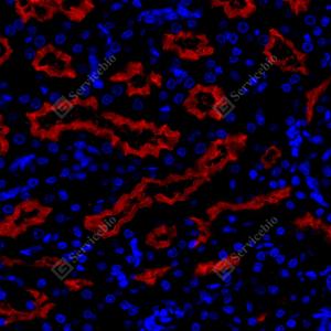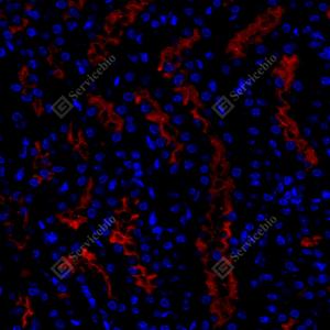 IF检测DPP4/CD26蛋白(货号 GB114937)(红色). 样品: 小鼠肾, 4%多聚甲醛 (货号G1101) 固定12-24小时. 抗原修复: Tris-EDTA抗原修复液(pH 9.0) (G1203), 98℃, 20分钟. 封闭: 3% BSA(货号GC305010)的PBS溶液, 室温孵育30分钟. —抗: 1: 500稀释, 4℃ 孵育过夜. 二抗: Cy3标记山羊抗兔IgG (H+L) (货号GB21303), 1: 300稀释, 室温孵育1小时. |