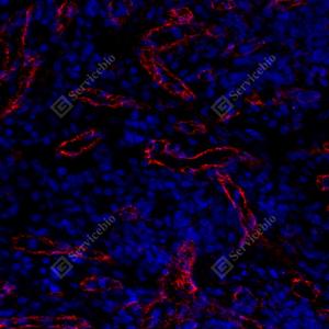 IF检测DPP4/CD26蛋白(货号 GB114937)(红色). 样品: 大鼠脾, 4%多聚甲醛 (货号G1101) 固定12-24小时. 抗原修复: Tris-EDTA抗原修复液(pH 9.0) (G1203), 98℃, 20分钟. 封闭: 3% BSA(货号GC305010)的PBS溶液, 室温孵育30分钟. —抗: 1: 500稀释, 4℃ 孵育过夜. 二抗: Cy3标记山羊抗兔IgG (H+L) (货号GB21303), 1: 300稀释, 室温孵育1小时. |