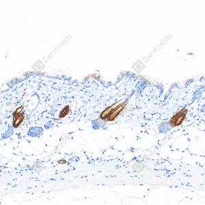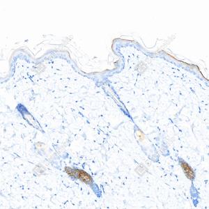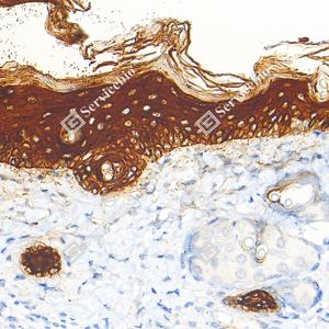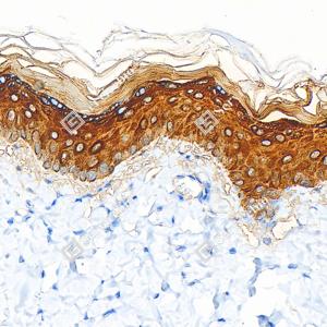 | IHC检测Cytokeratin 6蛋白 (货号 GB15824). 样品: 小鼠皮肤, 4%多聚甲醛 (货号G1101) 固定12-24小时. 抗原修复: Tris-EDTA抗原修复液(pH 9.0) (G1203), 100℃, 25分钟. —抗: 1: 500稀释, 4℃ 孵育过夜. 二抗: S-vision免疫组化多聚二抗(山羊抗兔),即用型 (货号G1302), 室温孵育20分钟. |