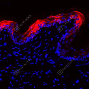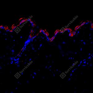 | IF检测Cytokeratin 6蛋白(货号 GB15824)(红色). 样品: 小鼠皮肤, 4%多聚甲醛 (货号G1101) 固定12-24小时. 抗原修复: Tris-EDTA抗原修复液(pH 9.0) (G1203), 100℃, 25分钟. 封闭: 3% BSA(货号GC305010)的PBS溶液, 室温孵育30分钟. —抗: 1: 500稀释, 4℃ 孵育过夜. 二抗: Cy3标记山羊抗兔IgG (H+L) (货号GB21303), 1: 300稀释, 室温孵育1小时. |
