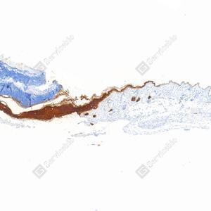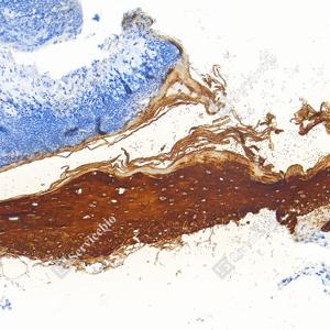 | IHC检测Cytokeratin 6蛋白 (货号 GB15824). 样品: 大鼠皮肤, 4%多聚甲醛 (货号G1101) 固定12-24小时. 抗原修复: Tris-EDTA抗原修复液(pH 9.0) (G1203), 100℃, 25分钟. —抗: 1: 500稀释, 4℃ 孵育过夜. 二抗: S-vision免疫组化多聚二抗(山羊抗兔),即用型 (货号G1302), 室温孵育20分钟. |