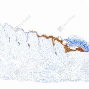 | IHC检测Cytokeratin 6蛋白 (货号 GB15824). 样品: 大鼠受损皮肤, 4%多聚甲醛 (货号G1101) 固定12-24小时. 抗原修复: Tris-EDTA抗原修复液(pH 9.0) (G1203), 100℃, 25分钟. —抗: 1: 500稀释, 4℃ 孵育过夜. 二抗: S-vision免疫组化多聚二抗(山羊抗兔),即用型 (货号G1302), 室温孵育20分钟. |