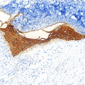 | IHC检测Cytokeratin 6蛋白(货号 GB15824). 样品: 大鼠受损皮肤, 4%多聚甲醛 (货号G1101) 固定12-24小时. 抗原修复: Tris-EDTA抗原修复液(pH 9.0) (G1203), 100℃, 25分钟. —抗: 1: 500稀释, 4℃ 孵育过夜. 二抗: S-vision免疫组化多聚二抗(山羊抗兔),即用型 (货号G1302), 室温孵育20分钟. |