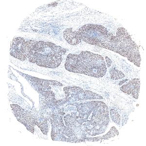 | IHC检测p40-DeltaNp63蛋白(货号 GB150178). 样品: 人食管癌, 4%多聚甲醛 (货号G1101) 固定12-24小时. 抗原修复: 抗原修复仪(货号 ARI-4), Tris-EDTA抗原修复液(pH 9.0) (货号G1203), 水浴100℃, 25分钟. —抗: 1: 1000稀释, 4℃ 孵育过夜. 二抗: S-vision免疫组化多聚二抗(山羊抗小鼠), 即用型(货号G1301), 室温孵育20分钟. |