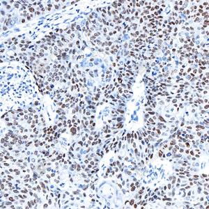 TP63, also named KET, P63, P73H, P73L and TP73L, belongs to the p53 family. It is a homologue of the tumor suppressor p53 and p73 genes. It is involved in malignancy acquisition and maintenance of cells. Unlike p53, the p63 gene encodes multiple isotypes with remarkably divergent abilities to transactivate p53 reporter genes and induce apoptosis. TP63 acts as a sequence specific DNA binding transcriptional activator or repressor. TP63 has 12 isoforms with MW 40kd(P40), 50kd(P60),63kd(P63) and 73kd(P73L). It is Nuclear stain.