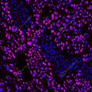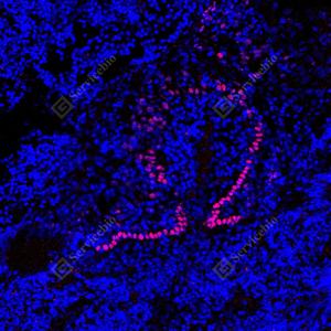 | IF检测p40-DeltaNp63蛋白(货号 GB150178)(红色). 样品: 人扁桃体, 4%多聚甲醛 (货号G1101) 固定12-24小时. 抗原修复: 抗原修复仪(货号 ARI-4), Tris-EDTA抗原修复液(pH 9.0) (货号G1203), 水浴100℃, 25分钟. 封闭: 3% BSA(货号GC305010)的PBS溶液, 室温孵育30分钟. —抗: 1: 1000稀释, 4℃ 孵育过夜. 二抗: Cy3标记山羊抗小鼠IgG (H+L) (货号GB21301), 1: 300稀释, 室温孵育1小时. |