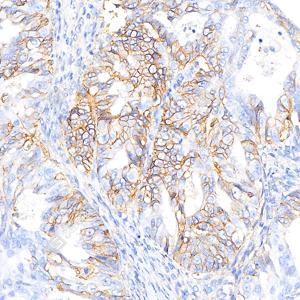 | IHC检测SLC7A11/xCT蛋白(货号 GB150180). 样品: 人结肠, 4%多聚甲醛 (货号G1101) 固定12-24小时. 抗原修复: 抗原修复仪(货号 ARI-4), Tris-EDTA抗原修复液(pH 9.0) (货号G1203), 水浴100℃, 25分钟. —抗: 1: 1200稀释, 4℃ 孵育过夜. 二抗: S-vision免疫组化多聚二抗(山羊抗小鼠), 即用型(货号G1301), 室温孵育20分钟. |