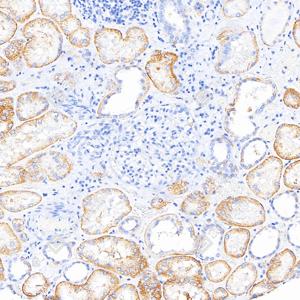 | IHC检测SLC7A11/xCT蛋白(货号 GB150180). 样品: 人肾, 4%多聚甲醛 (货号G1101) 固定12-24小时. 抗原修复: 抗原修复仪(货号 ARI-4), Tris-EDTA抗原修复液(pH 9.0) (货号G1203), 水浴100℃, 25分钟. —抗: 1: 1200稀释, 4℃ 孵育过夜. 二抗: S-vision免疫组化多聚二抗(山羊抗小鼠), 即用型(货号G1301), 室温孵育20分钟. |