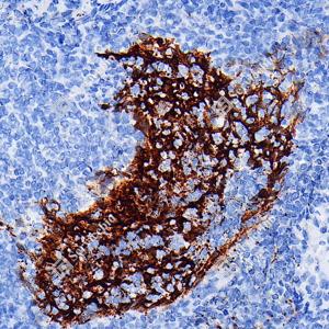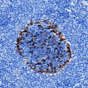 | IHC检测SLC7A11/xCT蛋白(货号 GB155276). 样品: 小鼠脾, 4%多聚甲醛 (货号G1101) 固定12-24小时. 抗原修复: 抗原修复仪(货号 ARI-4), Tris-EDTA抗原修复液(pH 9.0) (货号G1203), 水浴100℃, 25分钟. —抗: 1: 1500稀释, 4℃ 孵育过夜. 二抗: S-vision免疫组化多聚二抗(山羊抗兔),即用型 (货号G1302), 室温孵育20分钟. |