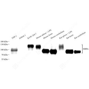WB检测SIRP alpha蛋白(货号 GB115426). 样品: 经RIPA裂解液(货号G2002)处理的蛋白质. 封闭: 封闭: 3%脱脂牛奶(货号GC310001)溶于TBST溶液, 室温孵育1小时. —抗: 1: 1000稀释, 4℃ 孵育过夜. 二抗: HRP标记山羊抗兔IgG (H+L) (货号GB23303), 1: 5000稀释, 室温孵育1小时. |