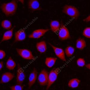 | ICC检测RIP3蛋白(货号 GB115634)(红色). 样品: L929细胞, 4%多聚甲醛 (货号G1101) 固定20分钟. 封闭: 3% BSA(货号GC305010)的PBS溶液, 室温孵育30分钟. —抗: 1: 500稀释, 4℃ 孵育过夜. 二抗: Cy3标记山羊抗兔IgG (H+L) (货号GB21303), 1: 300稀释, 室温孵育1小时. |